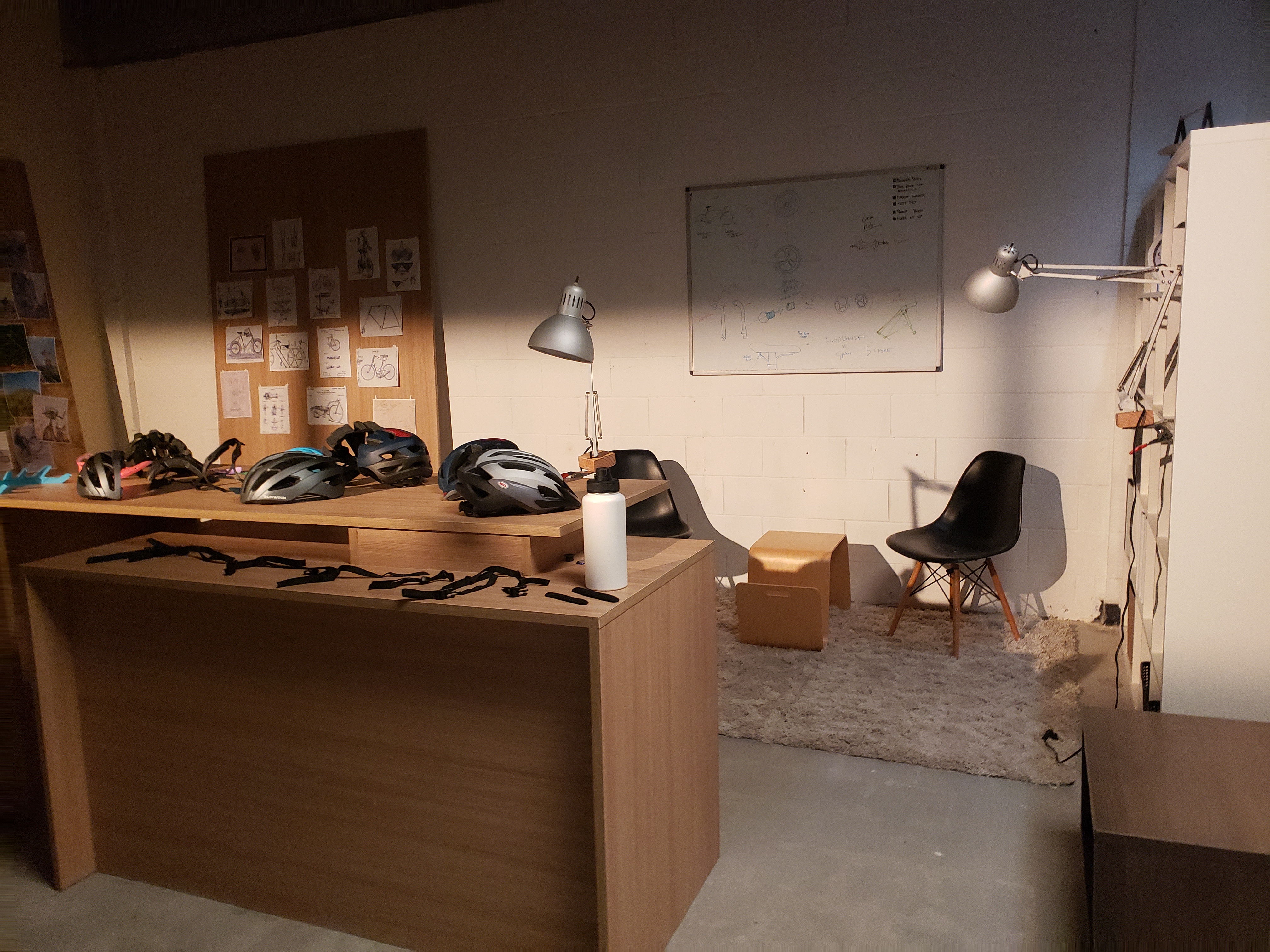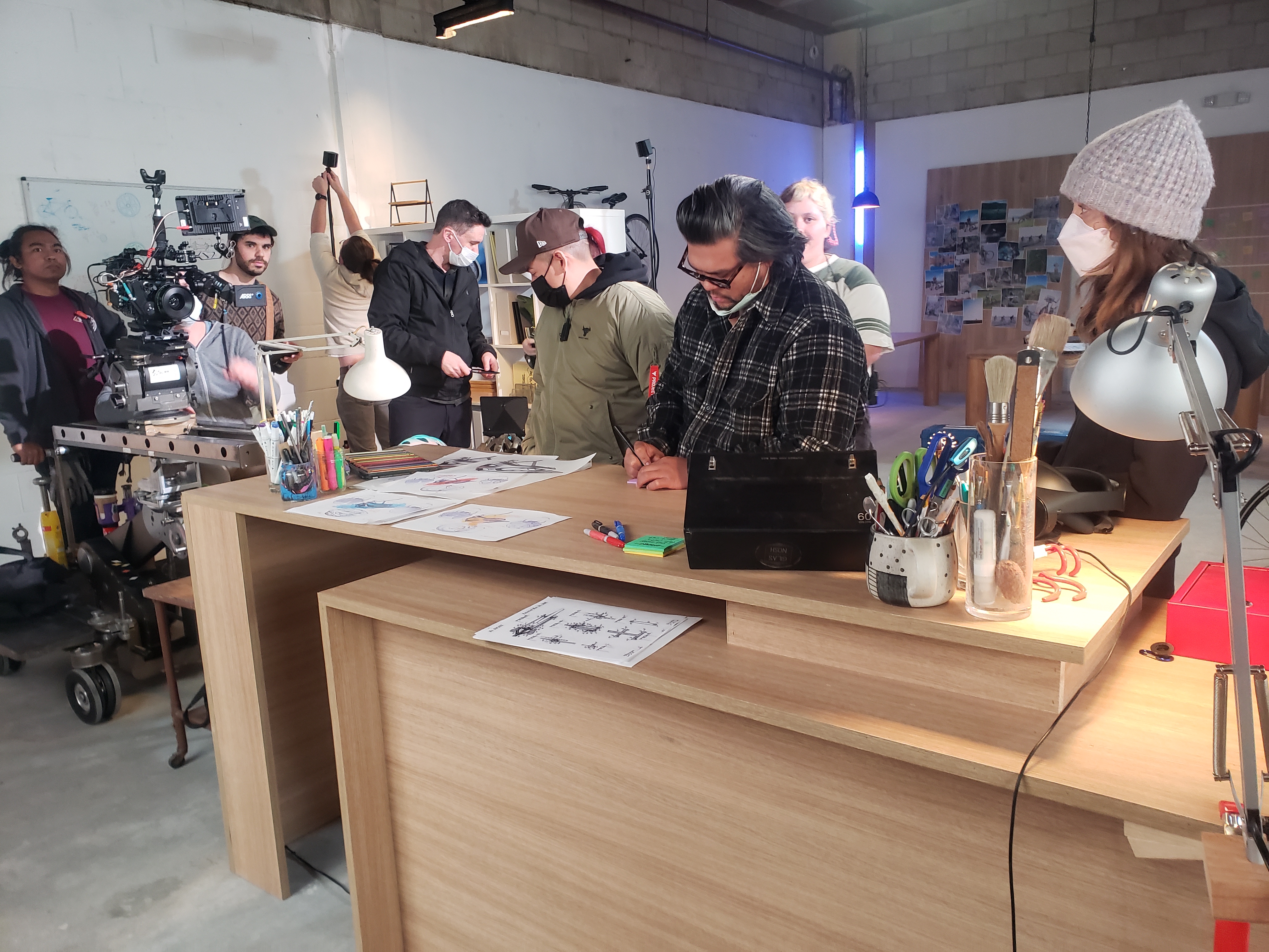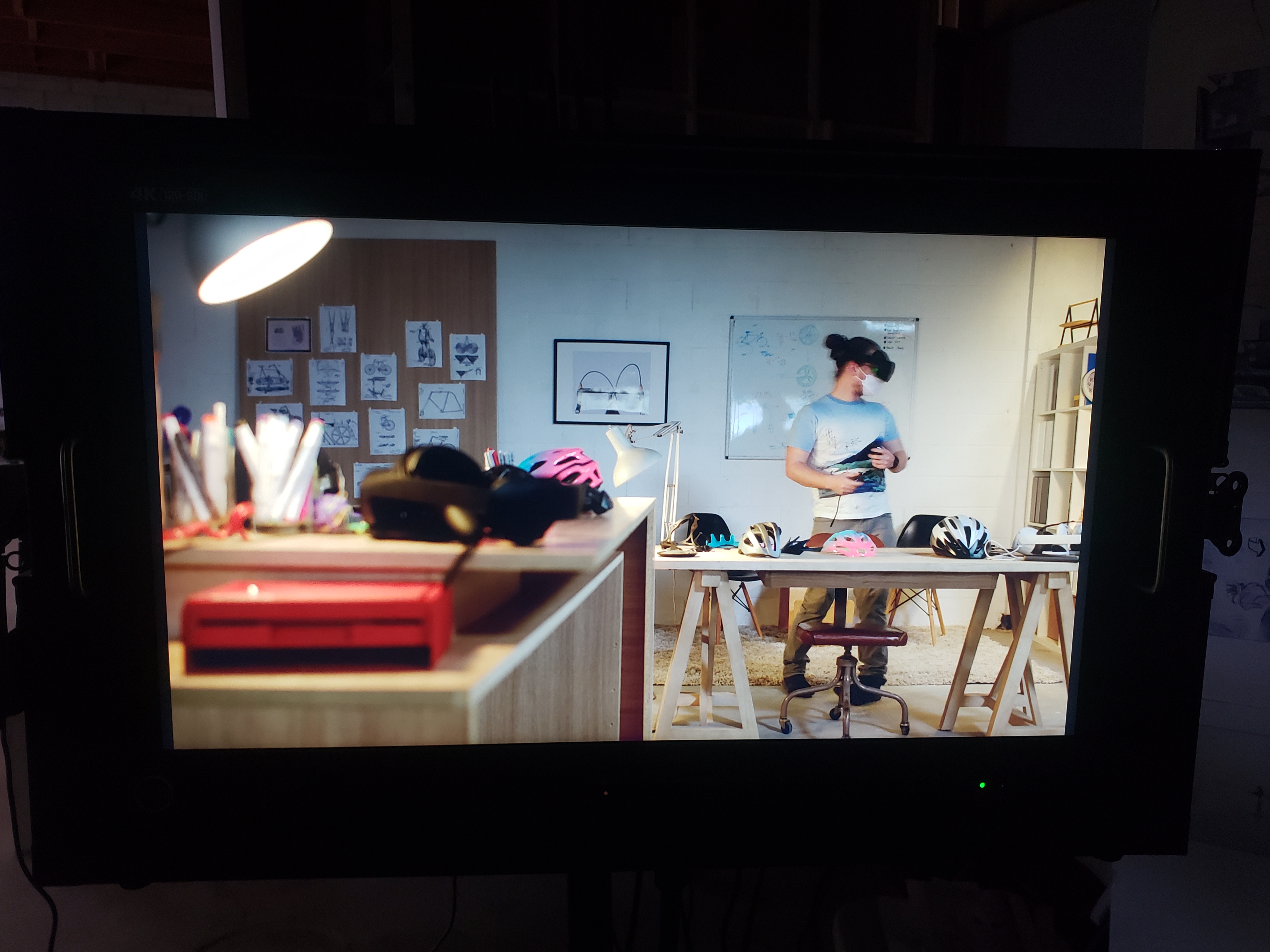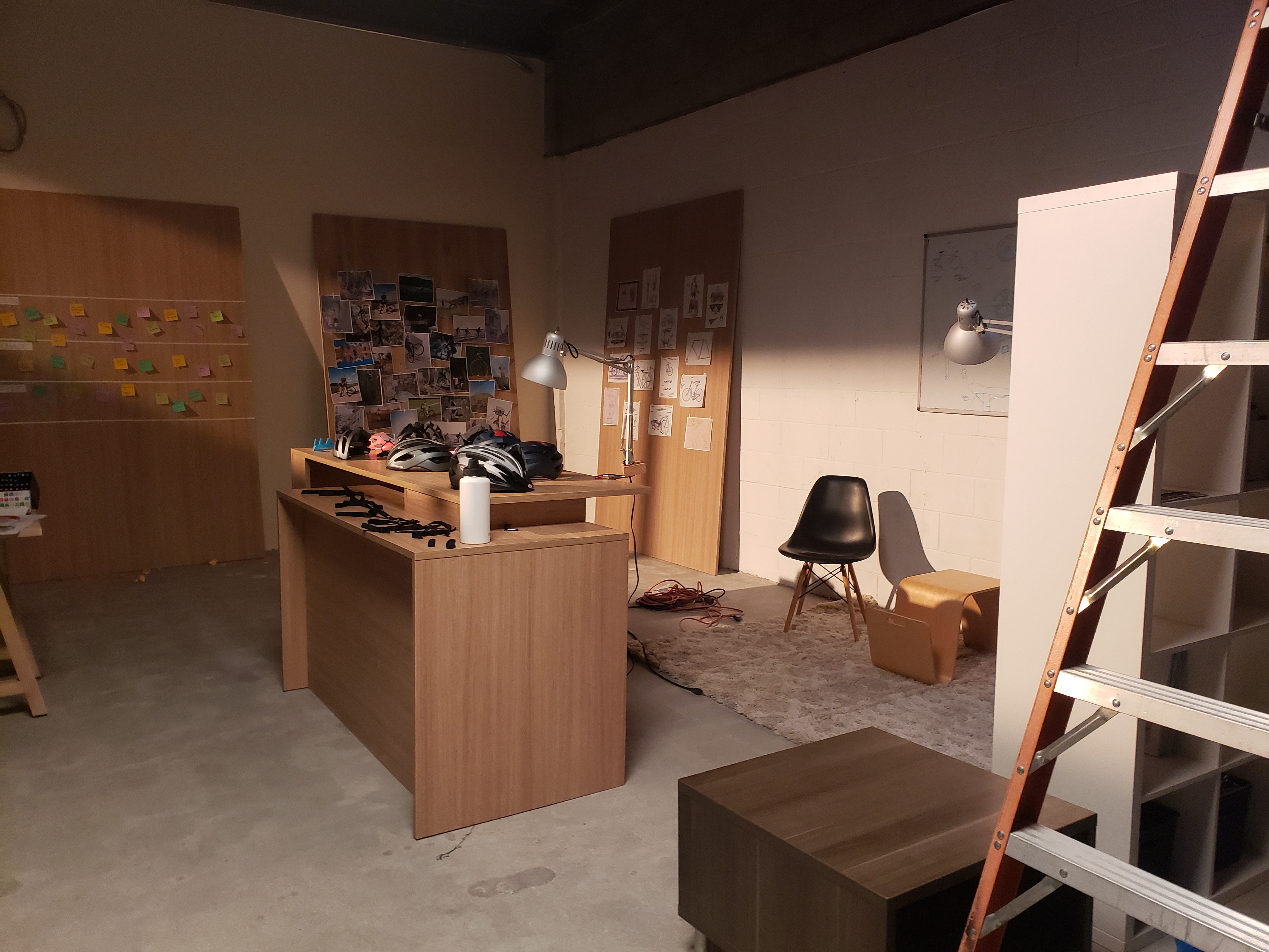 Office built for Gravity Sketch commercial. Working with a helmet designer, we created a "bike design shop" for our actors to use the VR visualization collaboration tools. Included in this design is custom transformable desk and furniture.