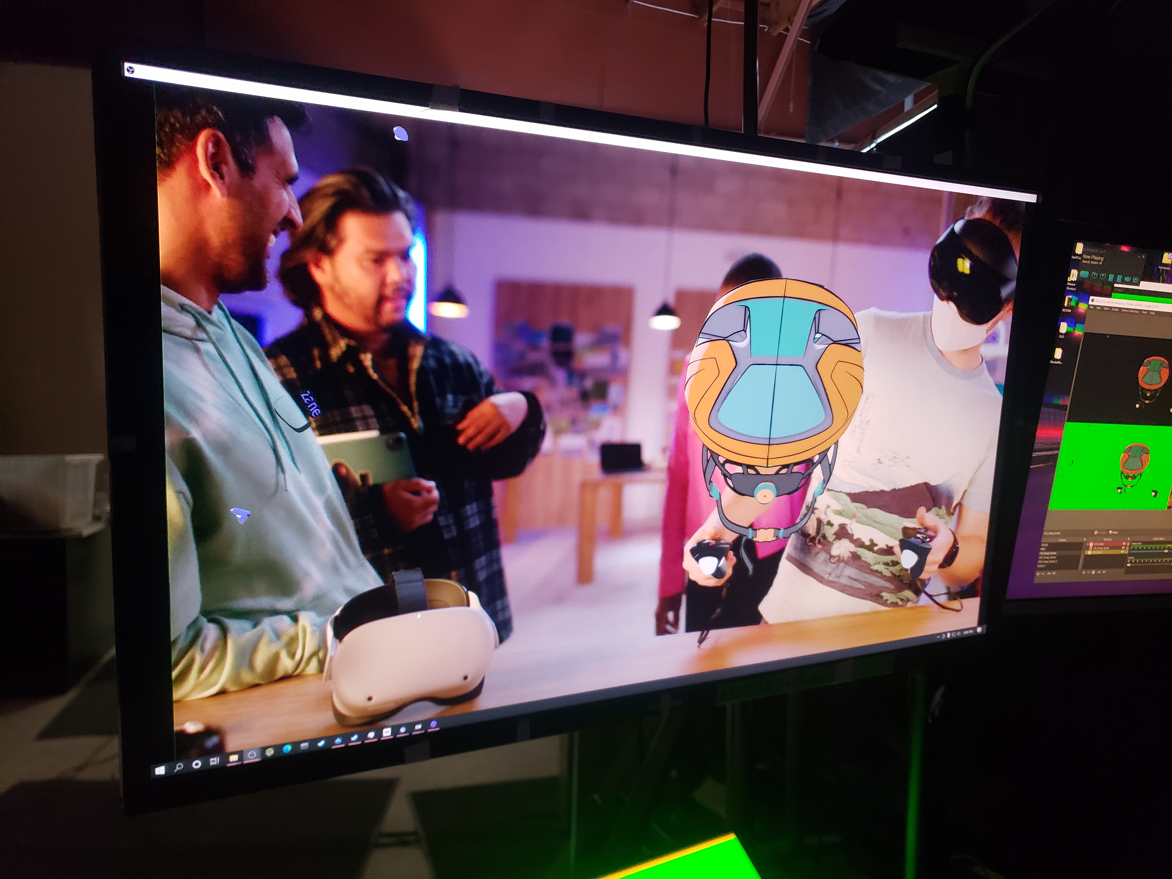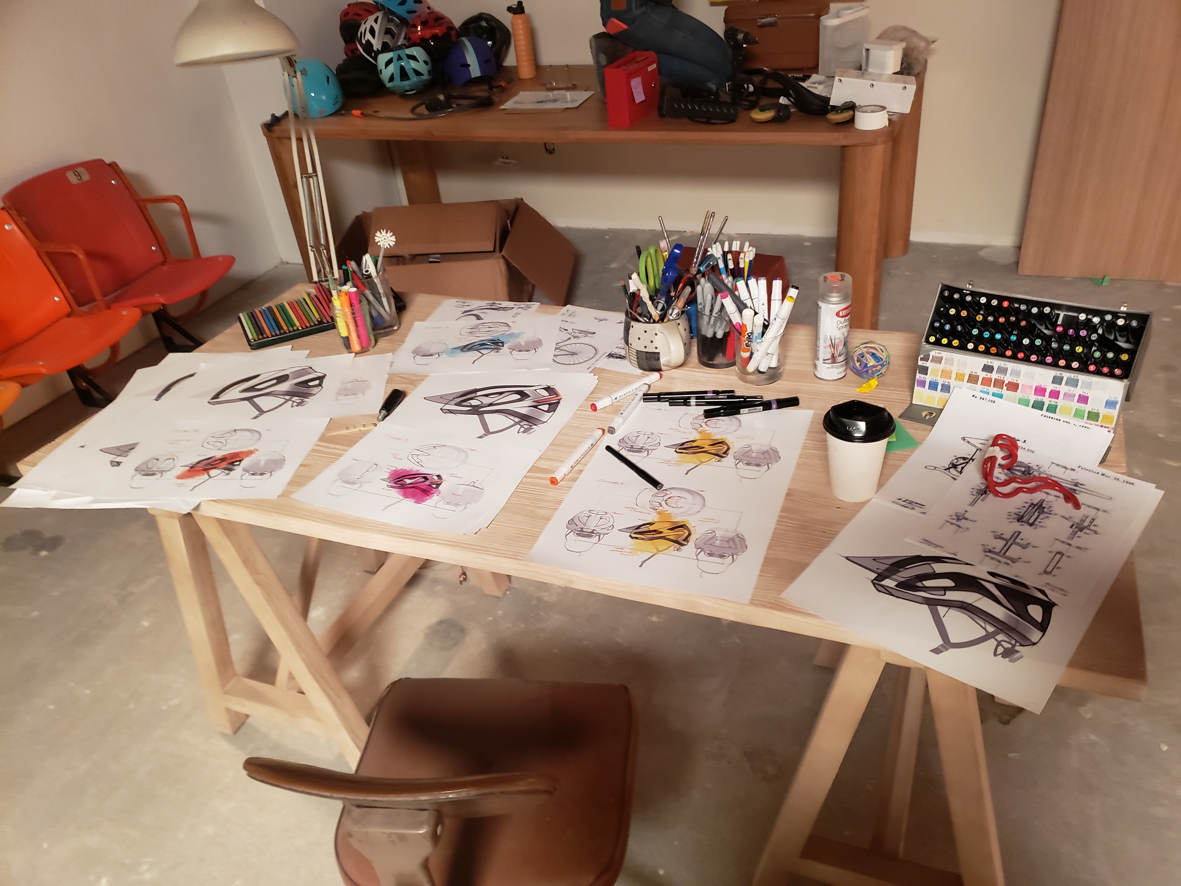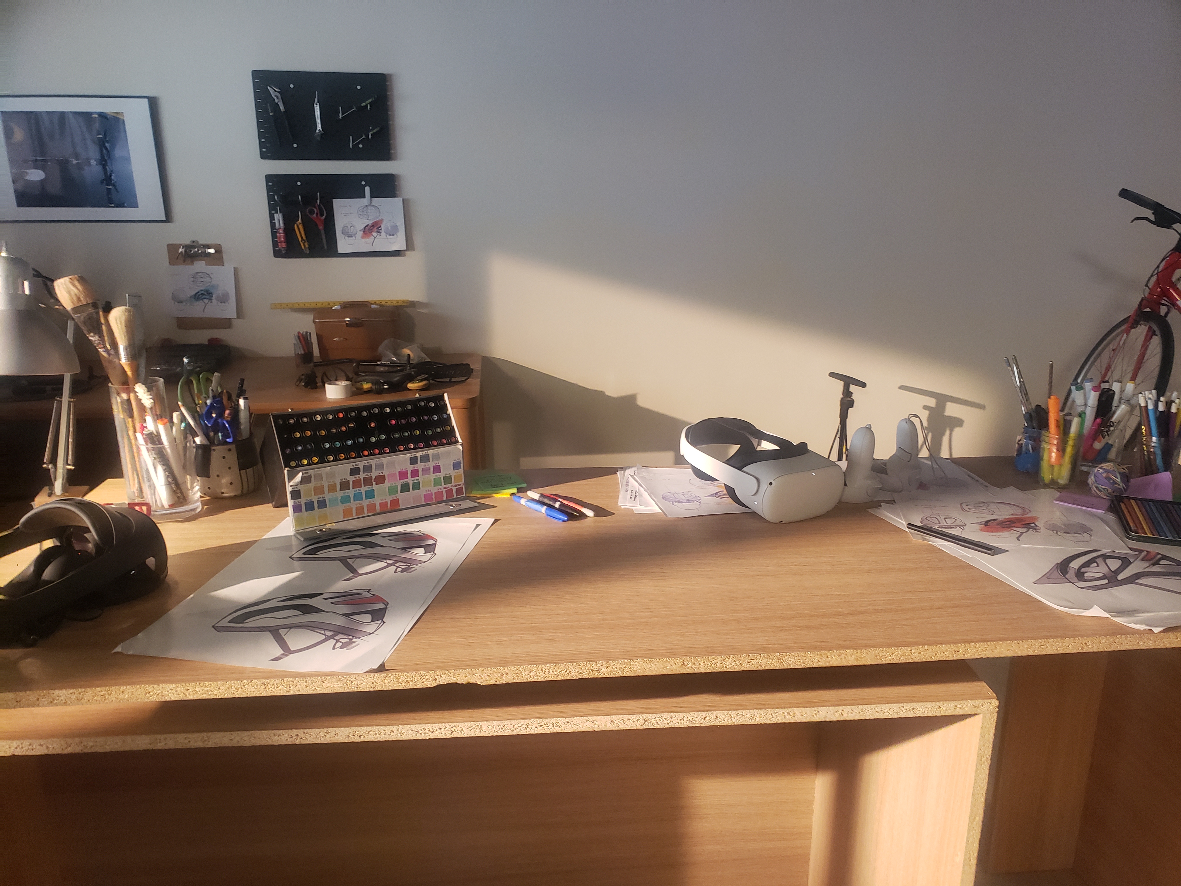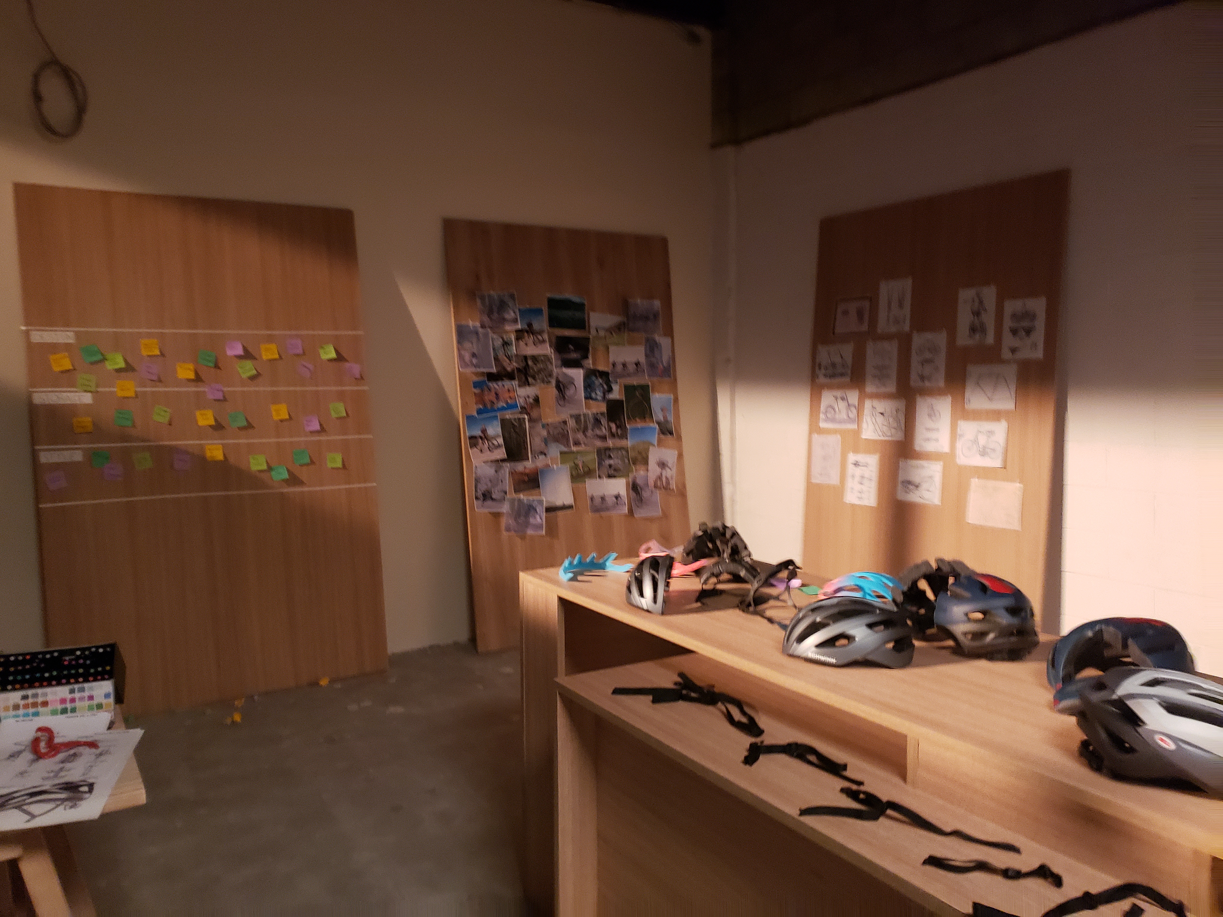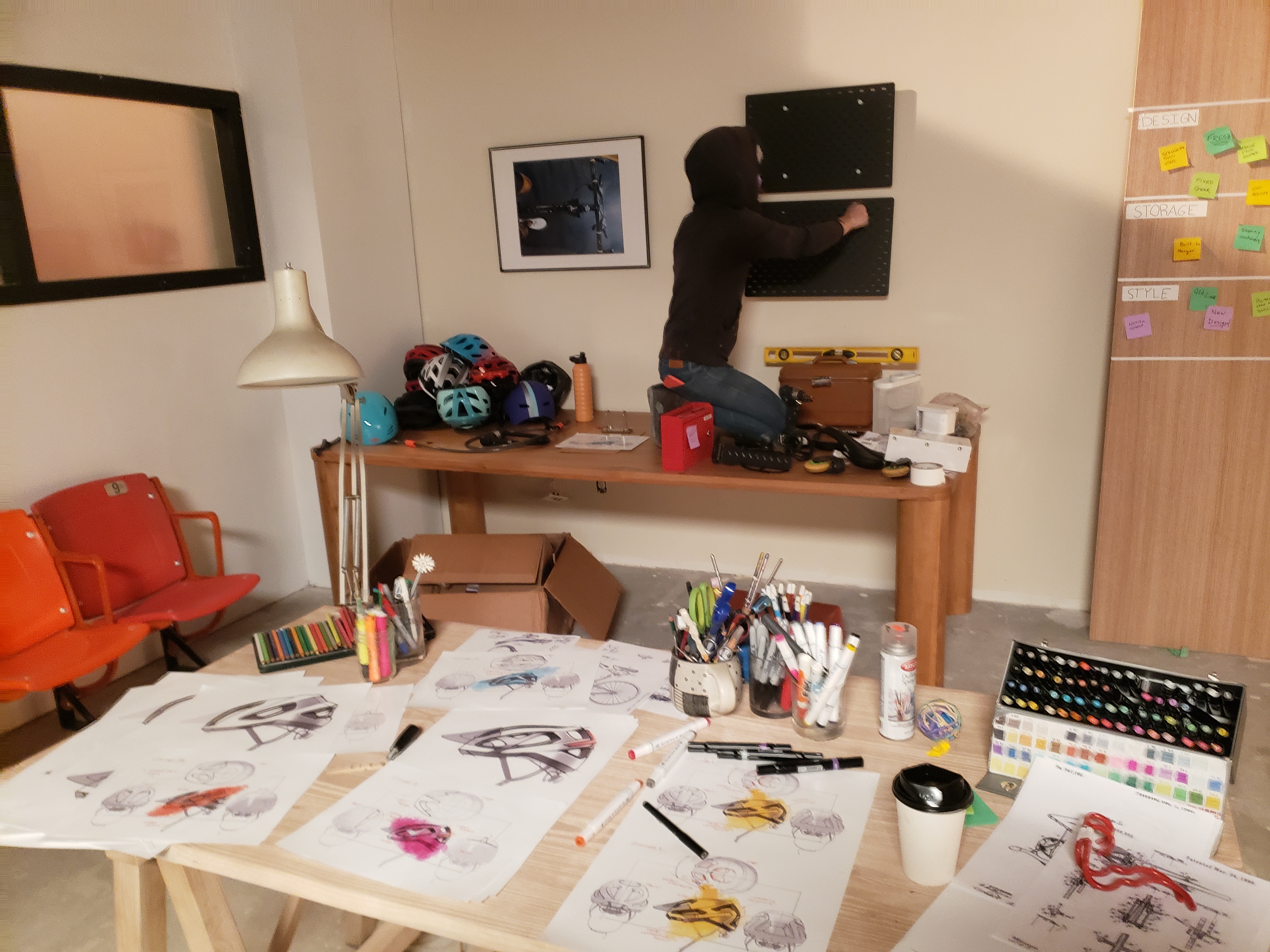 Office built for Gravity Sketch commercial. Working with a helmet designer, we created a "bike design shop" for our actors to use the VR visualization collaboration tools. Included in this design is custom transformable desk and furniture.